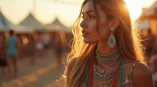 Le style bohème associé aux festivals musicaux mise sur l’exubérance maximale : accumulations massives, pièces volumineuses, couleurs saturées. Pour sophistiquer cette esthétique en milieu urbain ou professionnel, adoptez une approche sélective et raffinée. Conservez le principe de superposition mais réduisez le nombre de pièces : trois colliers au lieu de sept, deux bracelets au lieu de cinq.