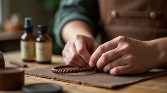 Le cuir, le macramé et les fibres tressées apportent une dimension tactile et artisanale aux accessoires. Le cuir se patine avec le temps, développant une authenticité unique qui raconte l’histoire de son porteur. Les différents types de tressage – simple, double, en arêtes de poisson – influencent à la fois la souplesse et l’esthétique finale de la pièce.